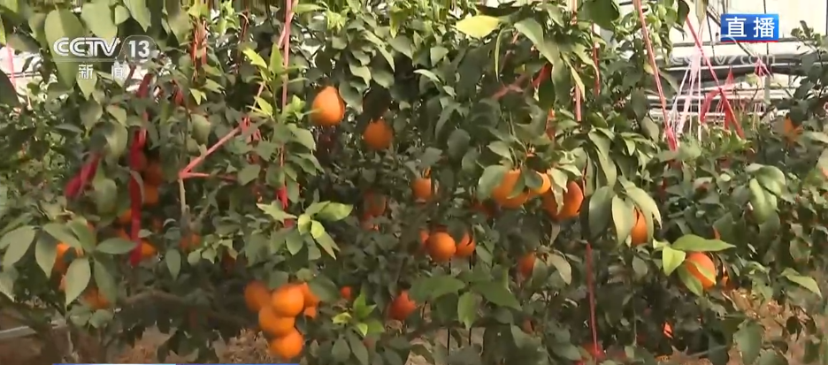 这段时间正好是当地柑橘品种红美人的丰收时节,在这里能特别直观地感受到,什么叫“沉甸甸的果实挂满枝头”。大家看这些果树,因为果实太重了,树枝都被压弯了,工作人员用绳子把枝条吊起来支撑住,避免枝条被压断。当然,这每一根被压弯的枝条背后都是乡亲们增收希望。整个园区的红美人年产量能超过500万斤,年总产值接近1亿元。
