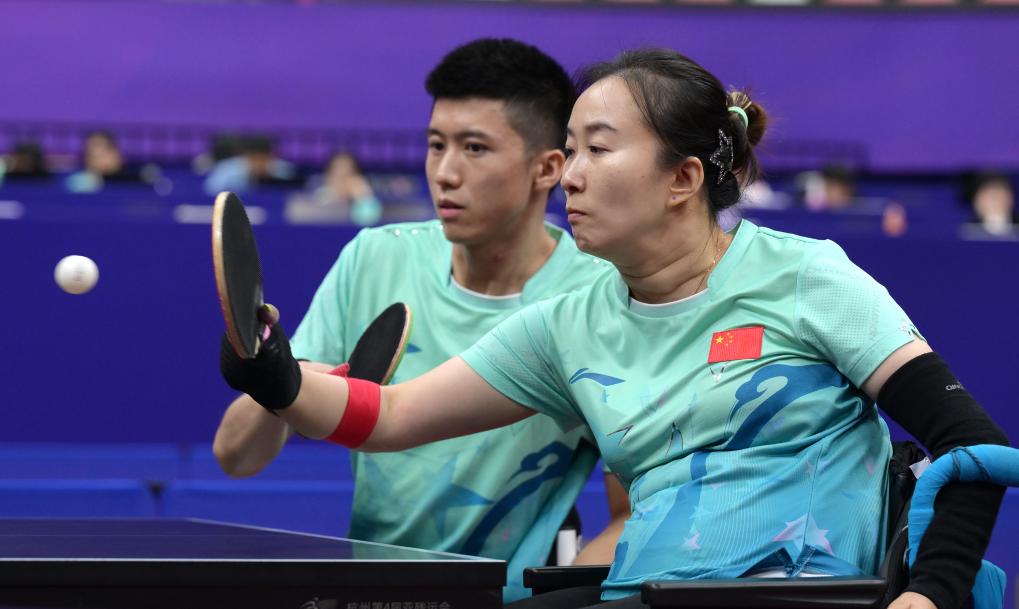 图为2023年10月26日,毛淋(前)和队友翟翔在杭州第4届亚残运会乒乓球混合双打4级B组的比赛中。新华社记者 李贺 摄