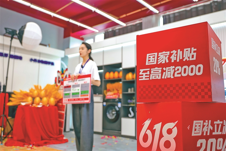 6月17日,主播在山东省青岛市李沧区一直播基地内介绍家电产品“国补”政策。新华社发(张鹰 摄)