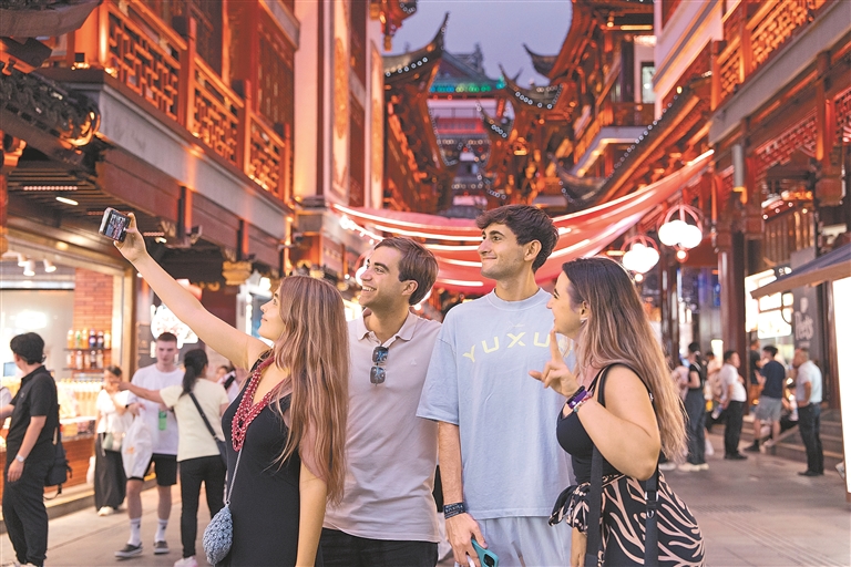 7月21日,西班牙游客在上海豫园商城留影。新华社发(张悦 摄)