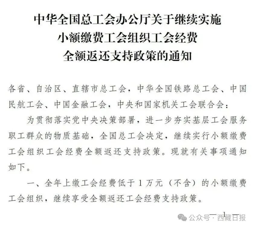 为加强基层工会工作,夯实基层工会服务职工的物质基础,2020年,全国总工会开始对小微企业工会经费实行全额返还的支持政策,2022年、2024年先后印发通知,继续实施小额缴费工会组织工会经费全额返还支持政策。