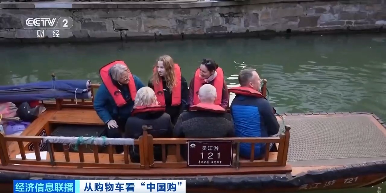 在江苏苏州,不少外国游客乘坐游船徜徉水巷,沉浸式感受中式生活美学的独特韵味。