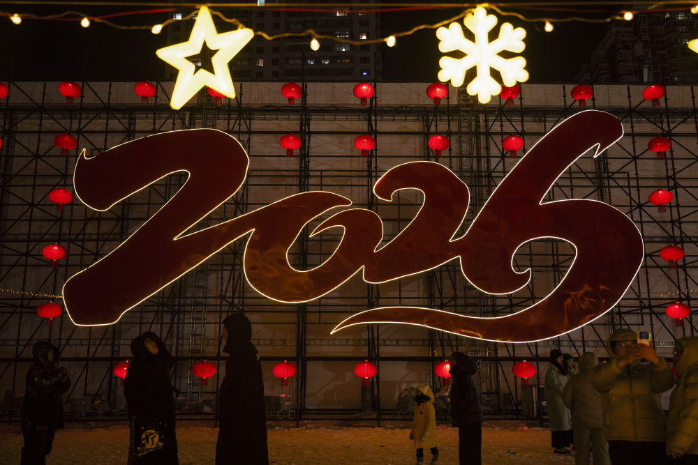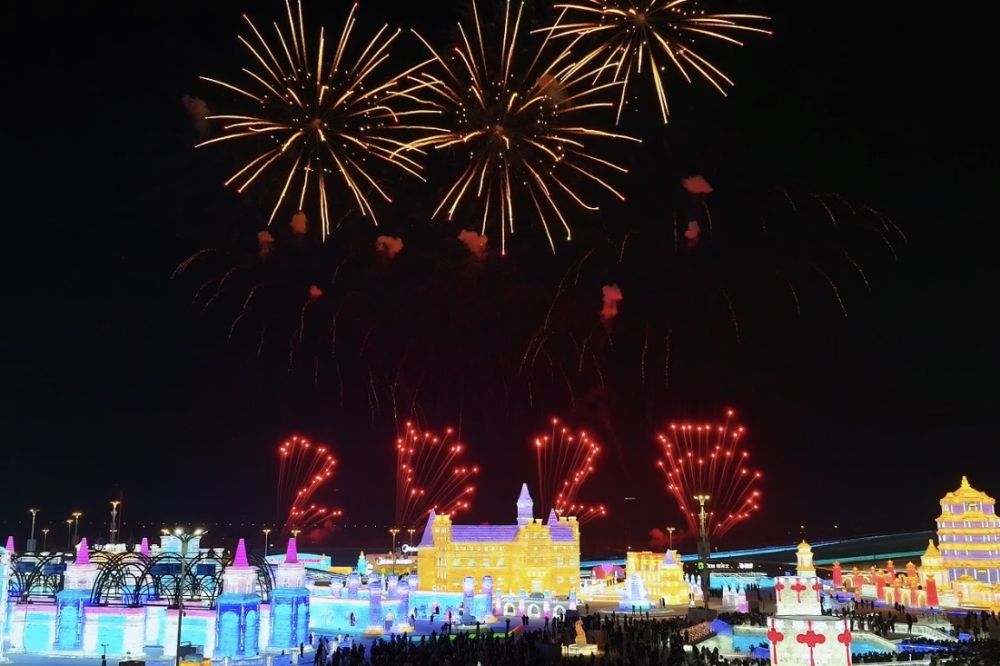 夜幕降临,跨年夜的烟花表演和无人机秀将这场狂欢推向高潮。五彩斑斓的烟花高高升起,如金色流苏,如繁花盛绽,与满园的冰雕相映成辉。特别是当“2026”字样的特制烟花亮相,现场游客发出阵阵欢呼。无人机在夜空中拼出一马当先、万马奔腾的动态景致,以及“冰天雪地”“新年欢乐”“阖家团圆”等祝福语,人们纷纷举起手机拍照。