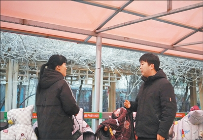 1月5日,河北省曲阳县永宁社区永宁花园小区内,社区干部(右)向居民了解车棚使用情况。 受访者供图