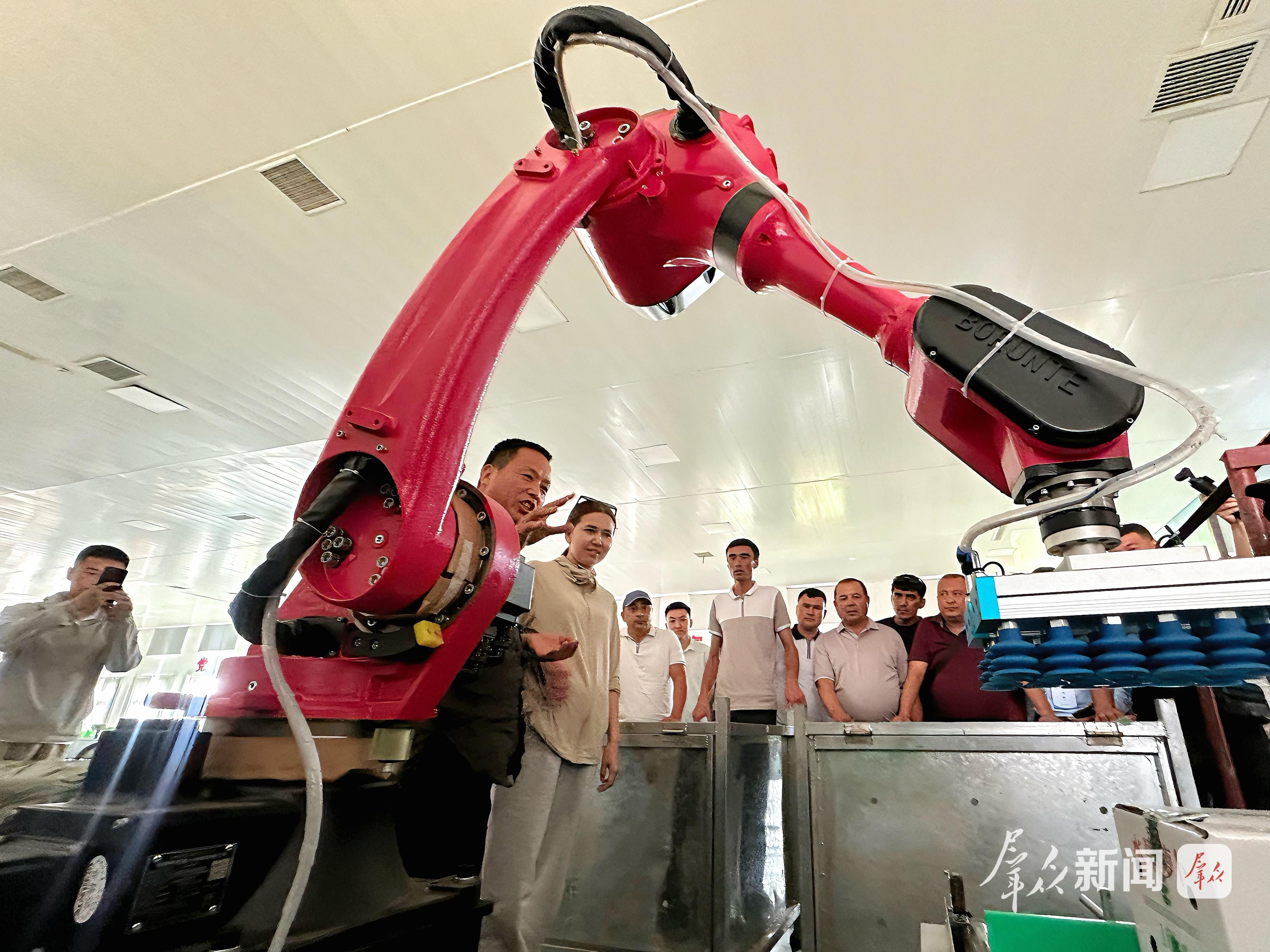 2025年6月14日,中亚五国职业农民培训班的学员在大荔县荔盛农业发展有限公司观摩智能分选设备。 群众新闻记者 陈宏江摄