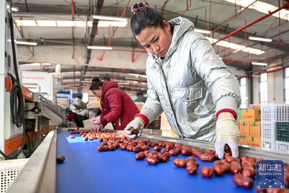 ↑ 在新疆和田地区墨玉县,和田源疆食品有限公司的工作人员在流水线上分拣红枣(1月9日摄)。
