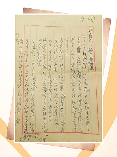 我以一半兴奋以一半悲伤的心绪写这封信给你,记起自南京别后已经是过了九个年头……我们时时在想念你,也曾流掉了不少思亲的眼泪。我们想象你老人家一定也日夜为你烽火中的儿女焦愁,你那油黑的双鬓也随着时光变为苍霜。现在战争是胜利了,故乡也已经收复,你要为你作战九年的儿女光荣而骄傲……