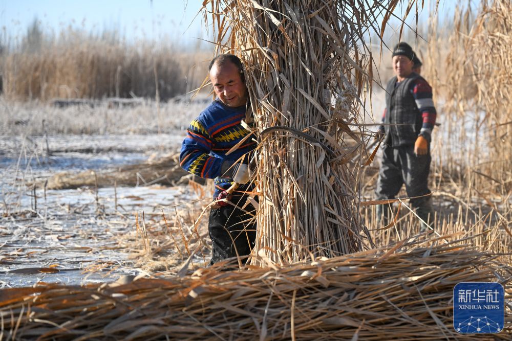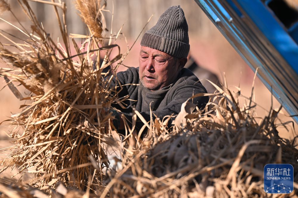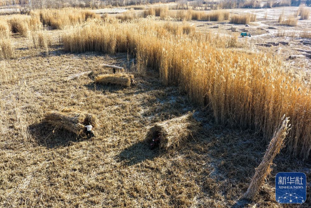↑ 在新疆和田地区墨玉县扎瓦镇,当地农民在收割芦苇(1月10日摄)。
