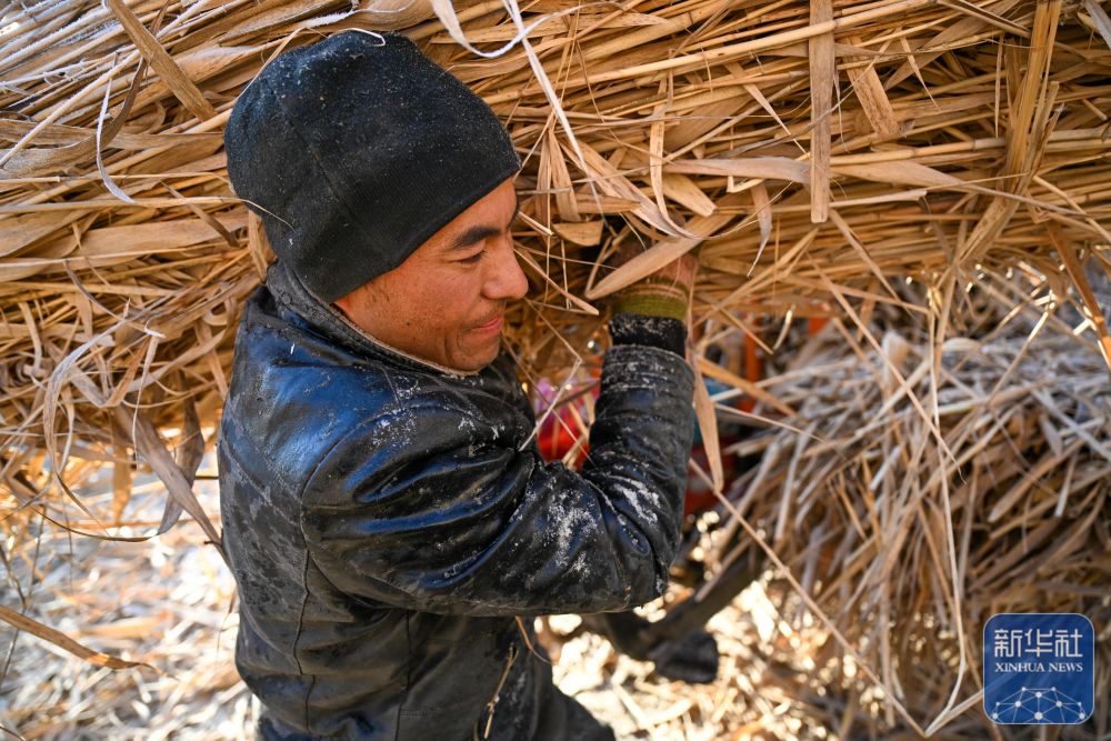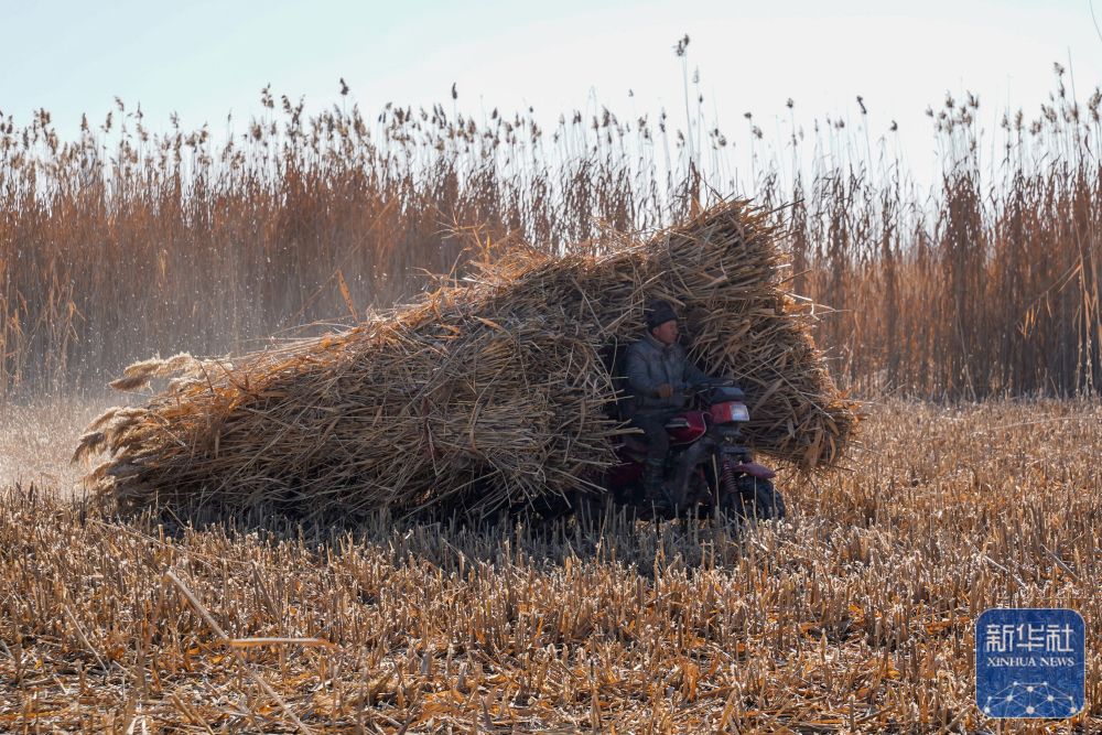 ↑ 在新疆和田地区墨玉县扎瓦镇,当地农民运送收割的芦苇(1月10日摄)。