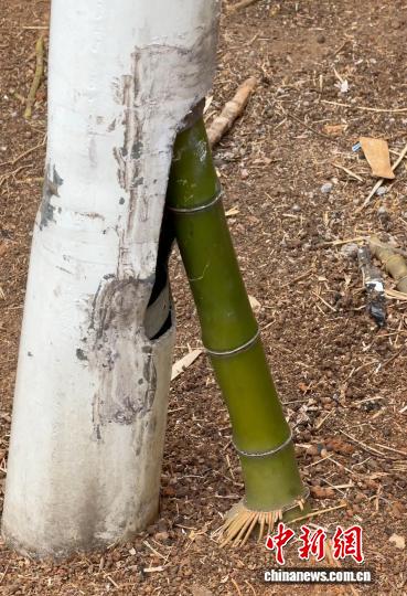 “竹坚强”位于新昌世贸广场内,该广场负责人潘若平受访时介绍,前段时间工人在清理这片竹林时,发现有一根竹子意外钻进了废弃的灯杆。“经过打理,我们将这根竹子保留下来,后来有心人拍下来发到了网上。这段时间,各地游客赶来见证这个奇观。为了保护好竹子、供大家更好地观赏,我们又在竹子周围安装了护栏。”潘若平说。