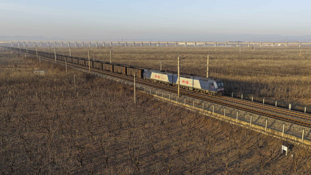 ↑ 1月25日,一列运煤专列途经大秦铁路河北省遵化市境内驶向秦皇岛方向(无人机照片)。新华社发(刘满仓 摄)