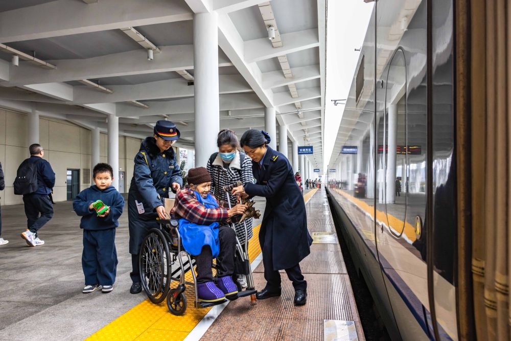 ↑ 1月25日,铁路工作人员在贵州安顺西站协助重点旅客乘车。新华社发(陈熙 摄)