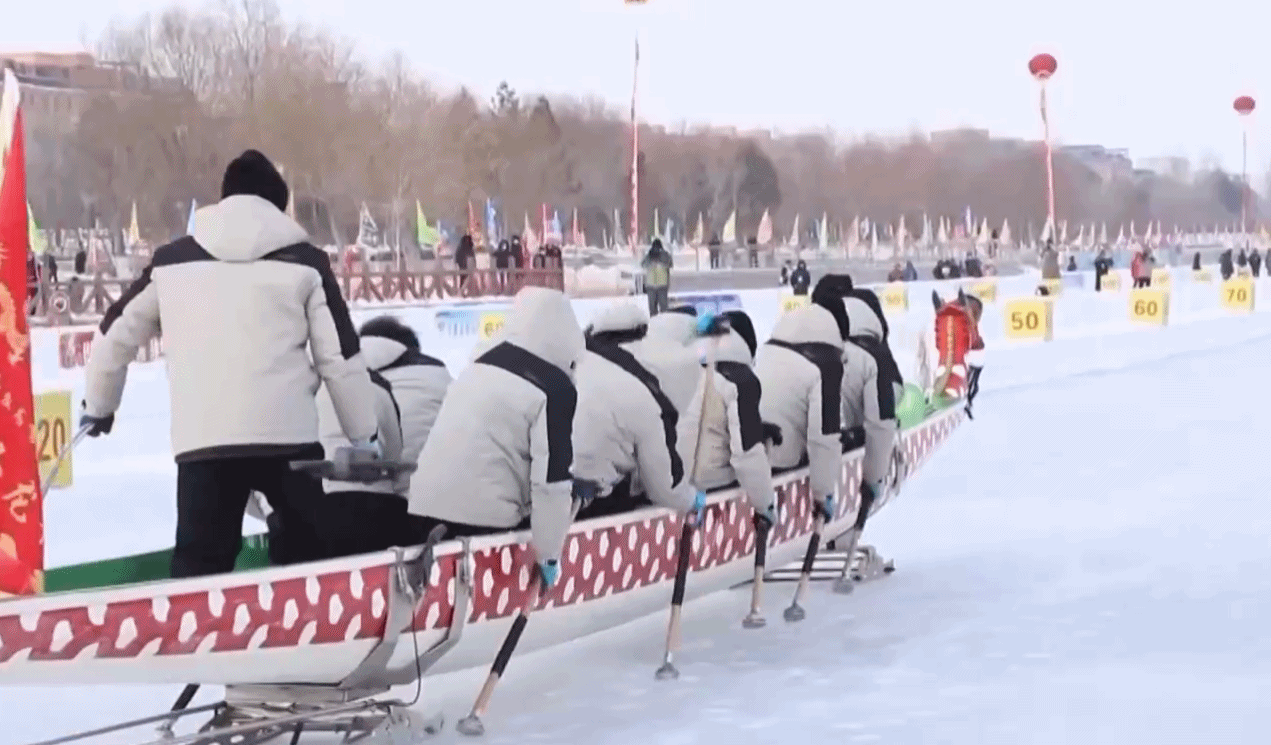 冰上龙舟保留了传统水上龙舟龙头龙尾的造型,底部加装专业冰刀,更考验选手们的默契与平衡性。比赛中,冰舟飞驰间冰屑四溅,周围观众和游客的呐喊助威声此起彼伏,使寒意凛冽的冬日变得火热起来。