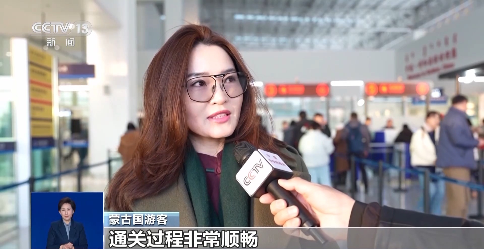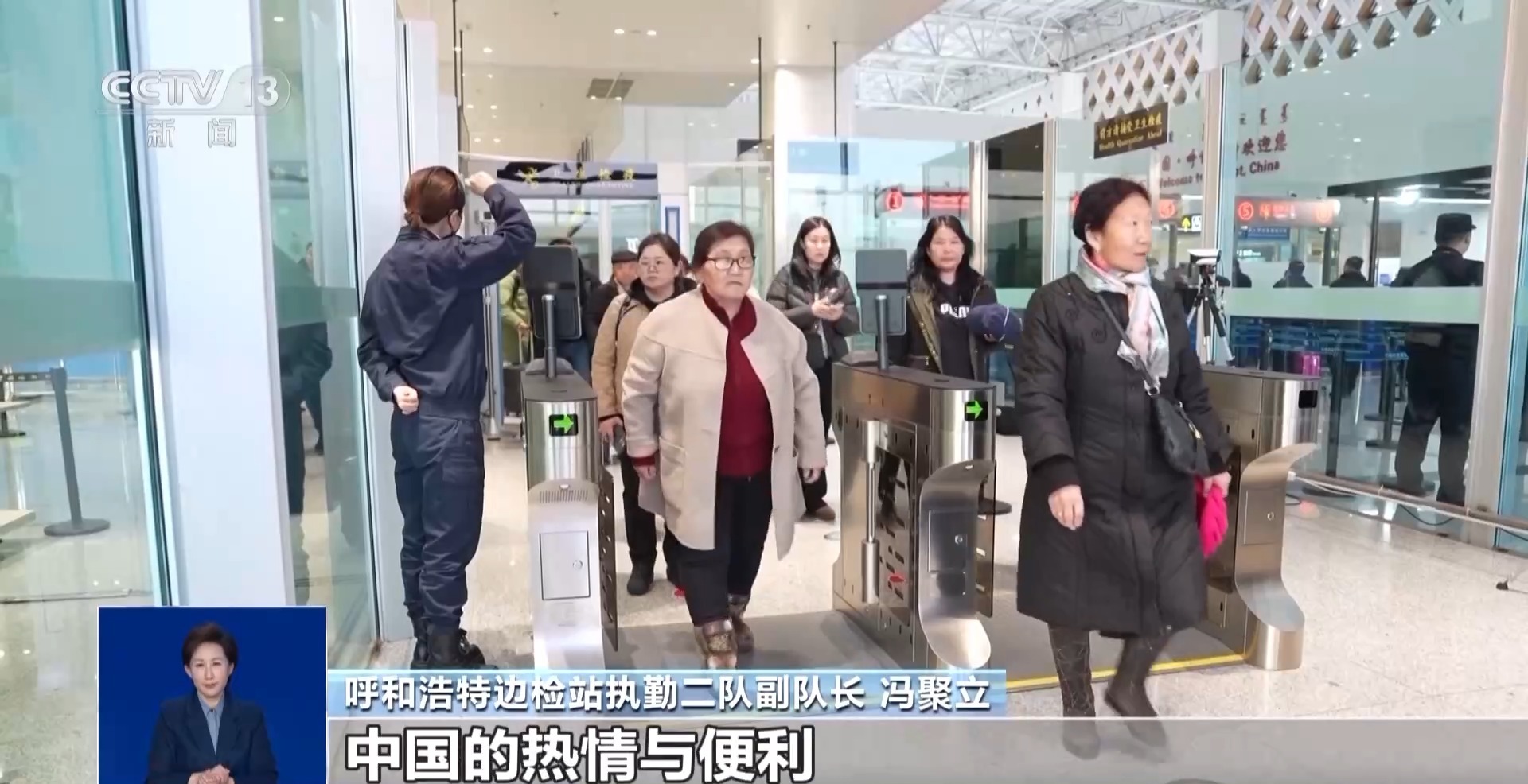 呼和浩特边检站执勤二队副队长冯聚立:我们优化查验流程,共开设人工查验通道6条、快捷通道3条,并在现场配备手持翻译设备,加强多语言引导服务,使旅客平均通关时间缩短20%,基本实现“随到随检、顺畅通关”,让外国游客第一时间感受到中国的热情与便利。