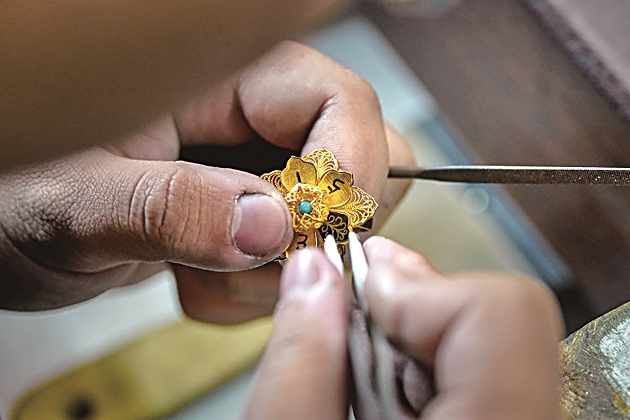 匠人在制作乌铜走银首饰。新华社发