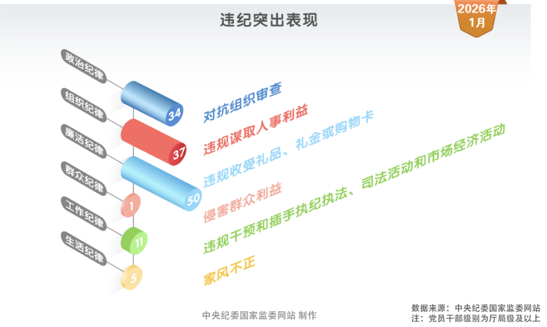 2026年1月,中央纪委国家监委网站通报的52名被处分党员、干部中,有47人存在违反政治纪律问题,其中34人存在对抗组织审查行为;在违反组织纪律行为中,违规谋取人事利益占比最高,有37人存在该违纪行为;违反廉洁纪律的50人均存在违规收受礼品、礼金或购物卡的行为;在违反工作纪律行为中,违规干预和插手执纪执法、司法活动和市场经济活动是突出违纪表现。