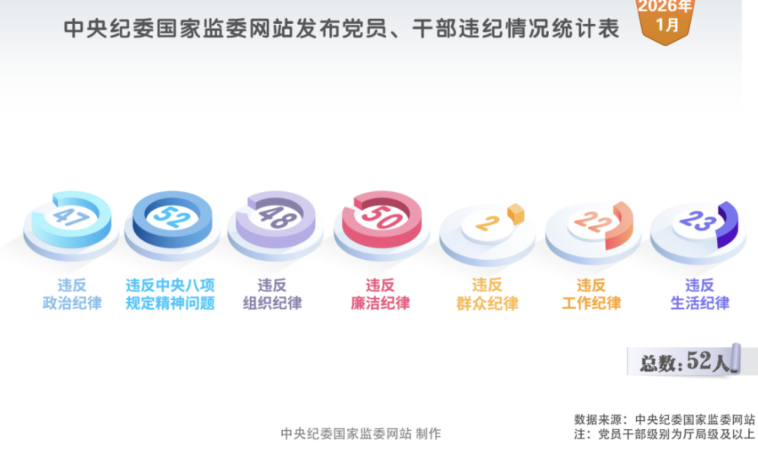 2026年1月,中央纪委国家监委网站发布的52条党纪政务处分信息中,47人违反政治纪律,52人违反中央八项规定精神,48人违反组织纪律,50人违反廉洁纪律,2人违反群众纪律,22人违反工作纪律,23人违反生活纪律。