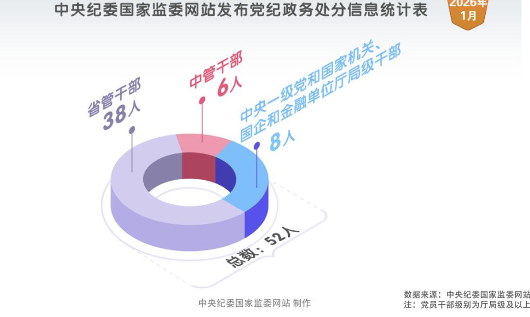 2026年1月,中央纪委国家监委网站共发布52条党纪政务处分信息。其中,中管干部6人,中央一级党和国家机关、国企和金融单位厅局级干部8人,省管干部38人。