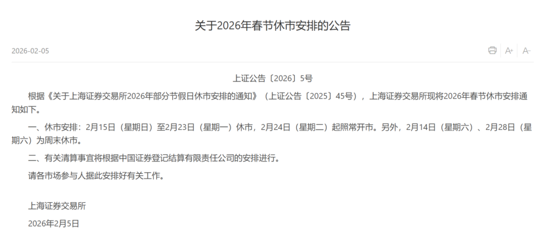深圳证券交易所2026年春节休市有关安排通知如下: