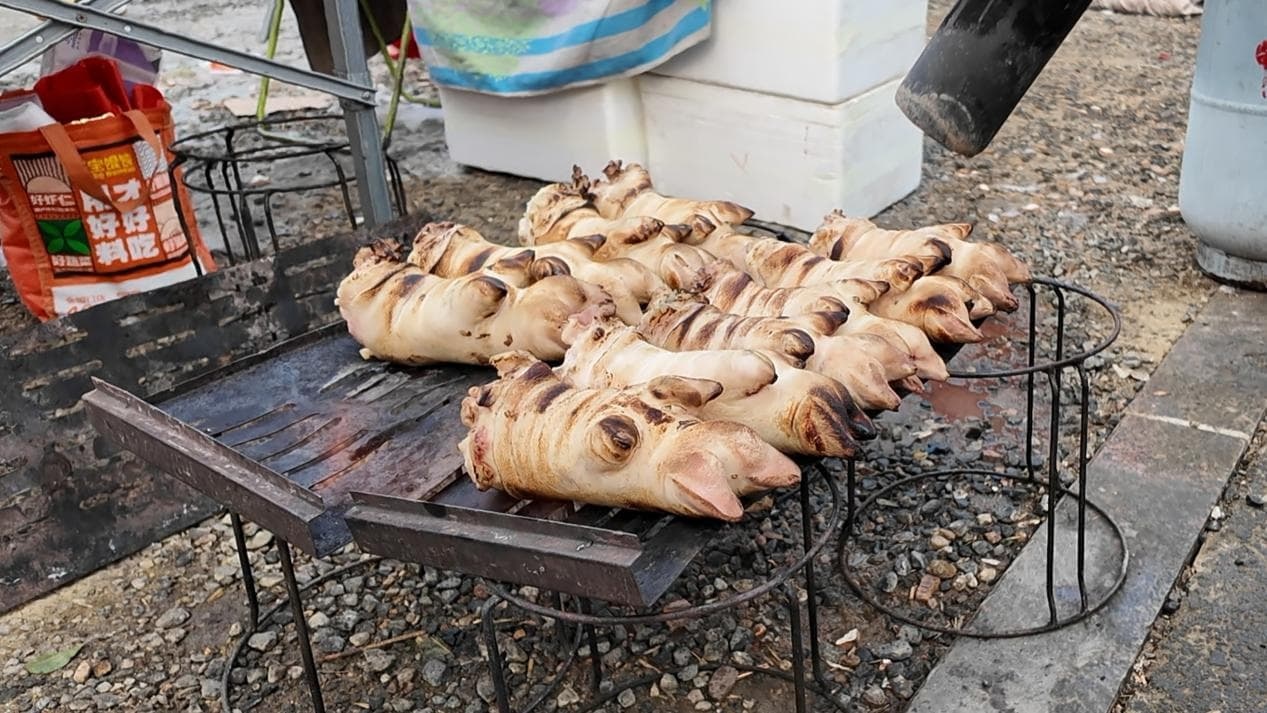 猪蹄摊位前,摊主王艳手持高温喷枪,娴熟地对着猪蹄反复炙烤。火光一闪,残留的猪毛瞬间燎净,表皮在高温下逐渐褪去油脂,看起来焦黑锃亮,脆香入味。70岁的仉力民把刚买的四个猪蹄放进手拉车里,拿出手机看下一个菜要准备什么。今年的年夜饭,他要为全家24口人张罗12道菜,每个人的口味得兼顾,菜品的色香味得考虑,一家人聚在一起吃顿团圆饭,哪个菜都不能含糊,为此,仉力民和老伴奔走了沈阳周边的多个大集。“过年在一起,就图个团团圆圆”,鱼、鸡、鲍鱼、螃蟹……仉力民年货清单上的食材一样样备齐,拖着手拉车满载而归。