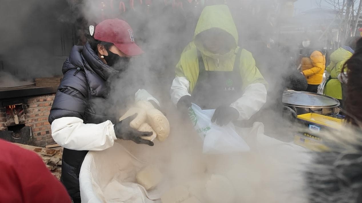 临近中午,馒头铺前开始排起长龙。半斤左右的大馒头,足有手掌大小,卖馒头的朱海麻利地把烫手的馒头快速装进包装袋,乐呵呵地跟老顾客闲聊几句,年根岁末,生意好,心情更好。很多顾客都是多次回购,有从市区赶来,也有从外地赶来的,有的一下子就要买三五十个,留着过年慢慢吃。做馒头用的小麦都是村里自己种的,蒸的时候用的是柴火灶,浓郁的麦香直往鼻子里钻。“俺家这大馒头,每个集都能卖出去5000个”,光想想这个数字,朱海心里都舒坦。