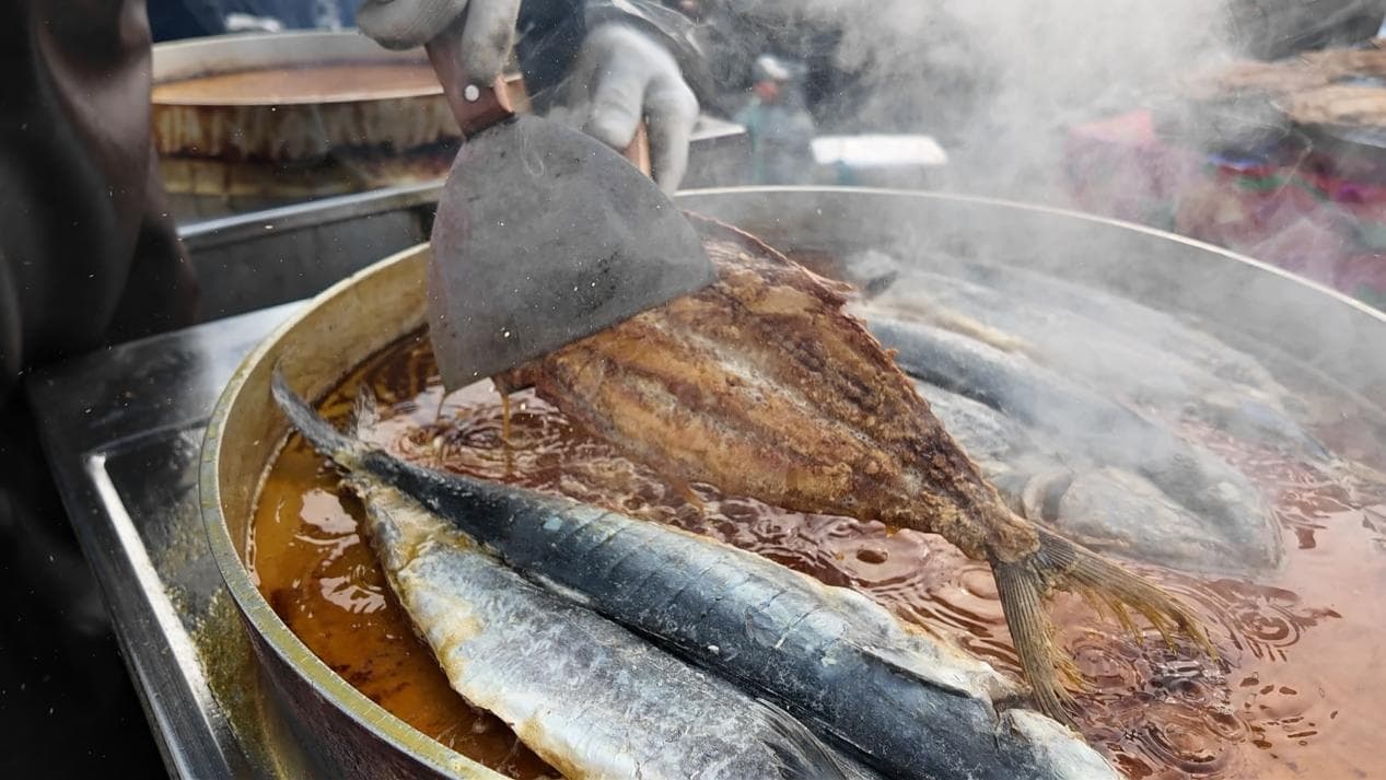 八点刚过,大集已经是一片热火朝天。400多家摊位次第铺开,一进大集,张美君的炸鱼摊飘出的香味就让人迈不动腿。香煎鲅鱼、踏板鱼、刀鱼,最大的鱼有近4斤重。张美君和家人做炸鱼已经有14个年头了,去年她把这份老手艺带到了沈阳,生意也是一天比一天红火。炸鱼外酥里嫩的口感,让她的回头客越来越多。临近春节,顾客更是络绎不绝,为尝一口鲜美的味道,也为讨一个“年年有余”的好彩头。