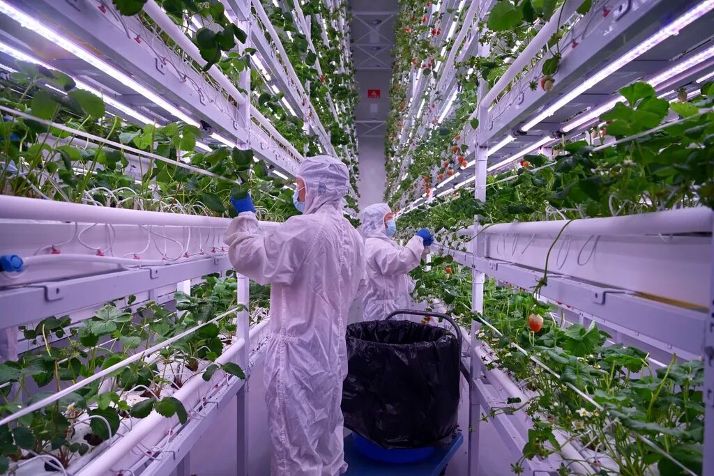 四川省成都市温江区中农·超级植物工厂工作人员运用垂直升降机进行草莓管护作业。这里是中国西南地区目前最大的规模化立体栽培草莓智慧工厂,平均每天能产出400斤新鲜草莓。
