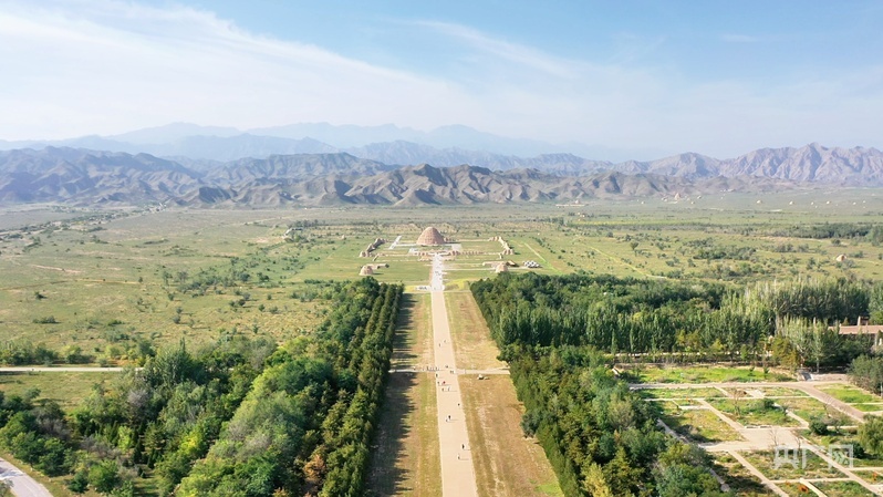 航拍视角下,西夏陵三号陵在贺兰山下的广袤原野上格外醒目(央广网记者 齐平 摄)