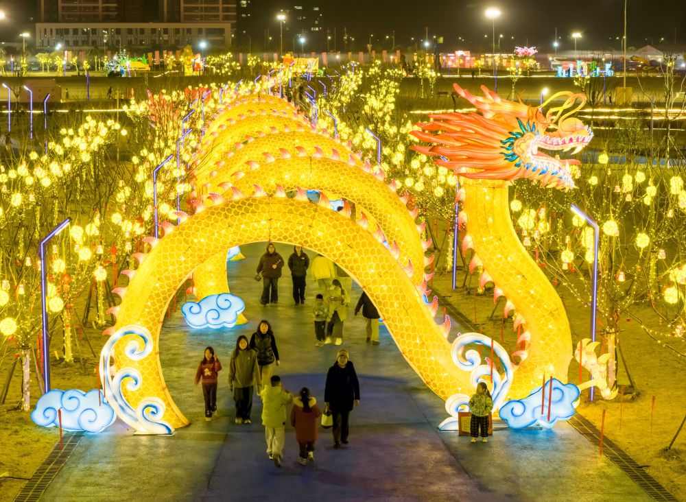 ↑ 2月14日,市民在江苏省兴化市莲溪湖公园赏灯游玩(无人机拍照)。新华社发(周社根 摄)