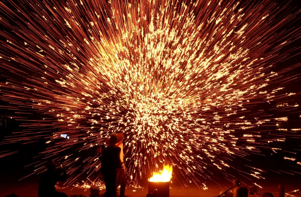 ↑ 2月14日,在河南省安阳市内黄县文化体育中心,民间艺人表演打铁花。新华社发(刘肖坤摄)