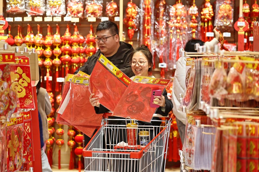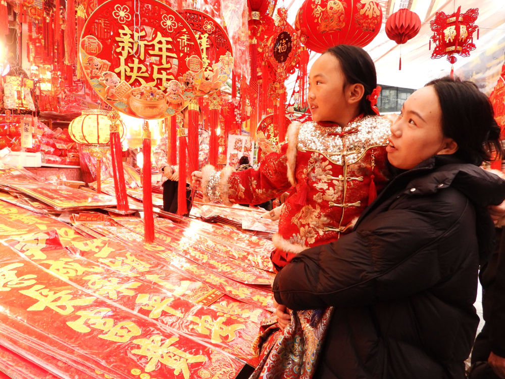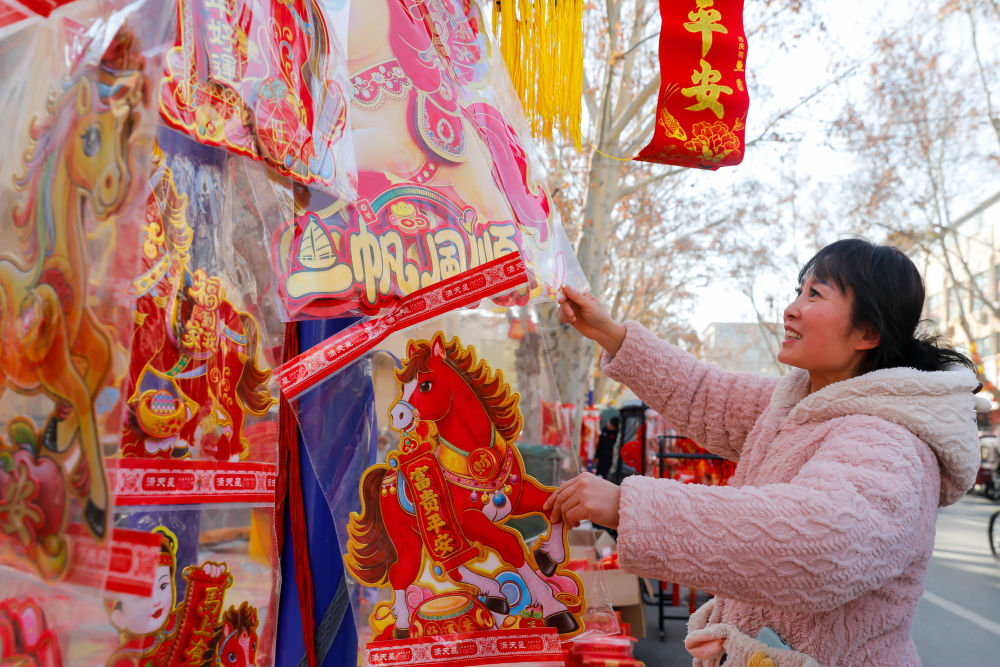 ↑ 2月14日,在河南省武陟县的一处年货市场,市民在选购新春饰品。新华社发(王琳锋 摄)
