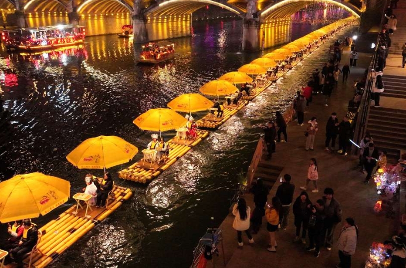 ↑ 2月14日,游客在湖北省宣恩县城贡水河上乘坐“龙游贡水”竹筏赏夜景(无人机照片)。新华社发(宋文 摄)