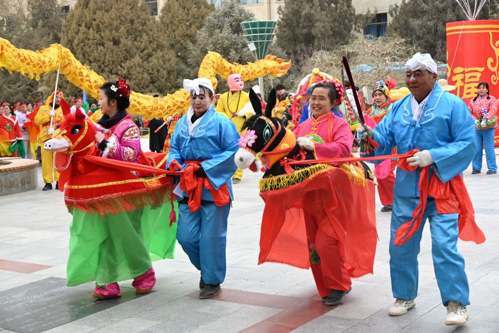 ↑ 2月15日,一支社火队在甘肃省敦煌市城区市政广场表演社火跑驴。新华社发(张晓亮摄)