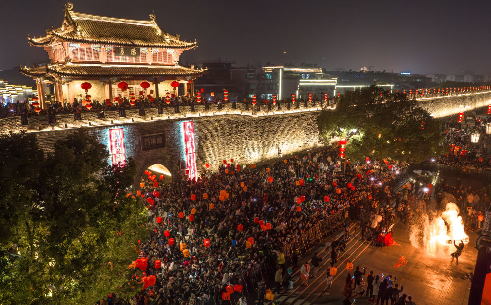 ↑ 2月14日,市民和游客在湖北省襄阳古城观看 “千灯临汉 万户迎春”迎新春演出(无人机照片)。新华社发(杨东 摄)