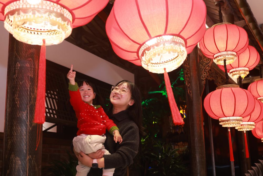 ↑ 2月14日晚,游客在四川省成都市武侯祠赏灯。新华社发(李向雨 摄)