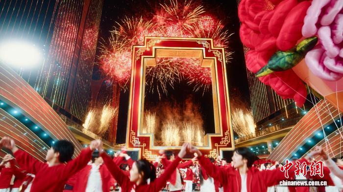 中新网义乌2月17日电(董易鑫)一扇巨型中式窗户矗立于充满科技感的浙江义乌全球数贸中心,舞台向前延展,两侧装饰如潮涌浪花般,铺陈出“勇立潮头”的意象……