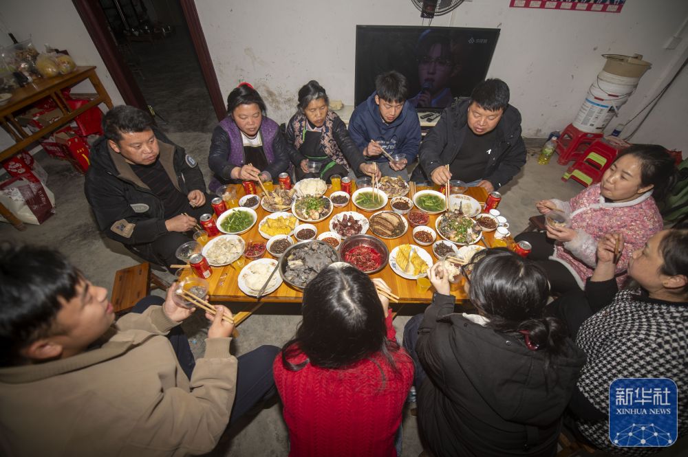 ↑ 2月16日,贵州省黔东南苗族侗族自治州从江县丙妹镇大塘村一户居民吃年夜饭。新华社发(吴德军 摄)