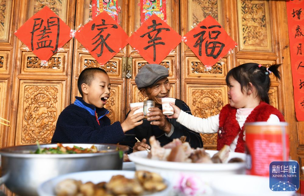 ↑ 2月16日,在云南省大理白族自治州剑川县马登镇文屏村,老人和孙辈吃年夜饭。新华社发(赵庆祖 摄)
