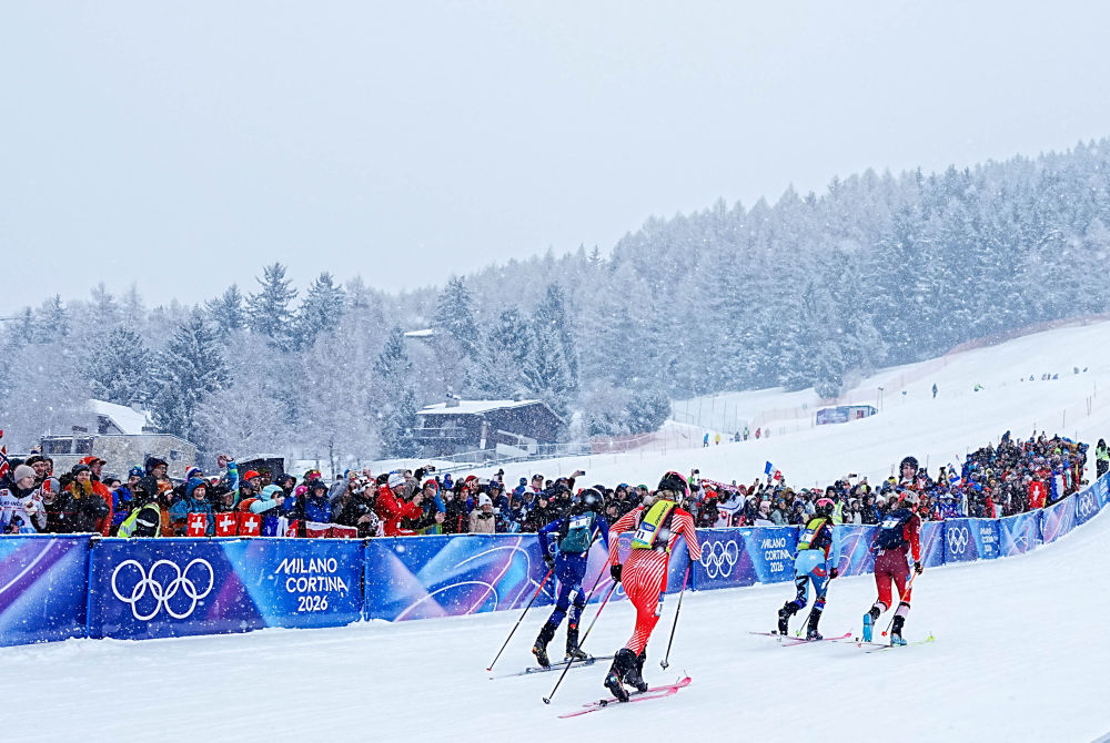 2026年2月19日,布鲁尔(中)在米兰-科尔蒂纳冬奥会滑雪登山男子个人短距离比赛中。新华社记者 胡虎虎 摄