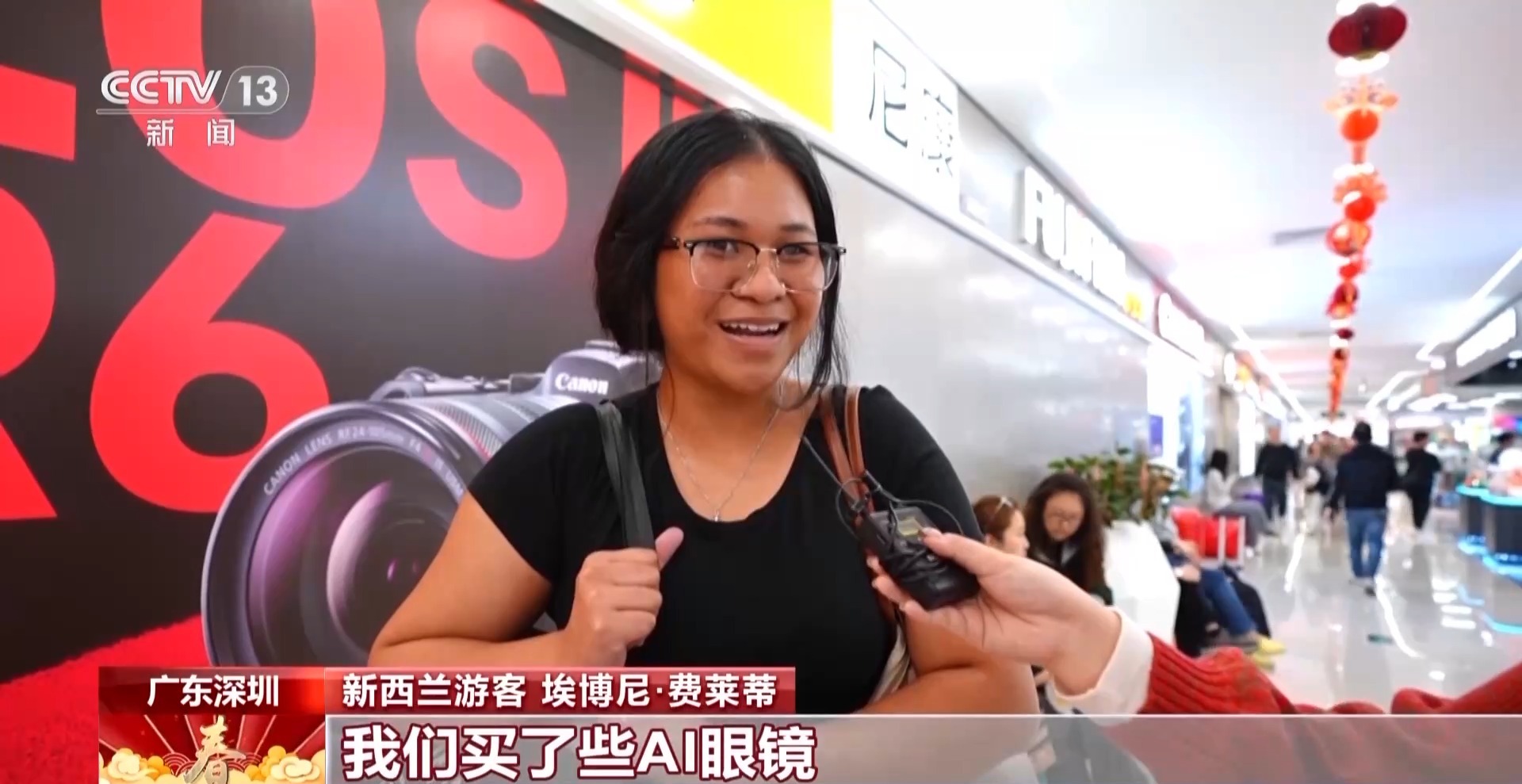 新西兰游客 埃博尼·费莱蒂:我们买了些AI眼镜,它让我们在这里沟通交流变得更方便,这对我们是很大的帮助。