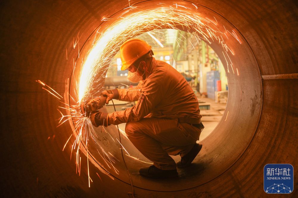 ↑ 2月24日,在江苏省连云港经济技术开发区重山风电设备公司车间,工人在生产风电塔架。新华社发(王健民摄)