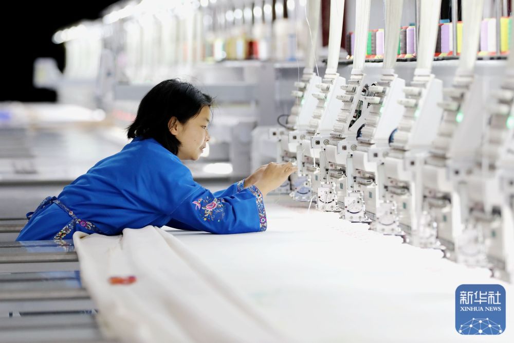↑ 2月24日,工人在贵州省黔东南苗族侗族自治州施秉县一家数字化苗绣企业生产车间赶制订单产品。新华社发(邰胜智摄)