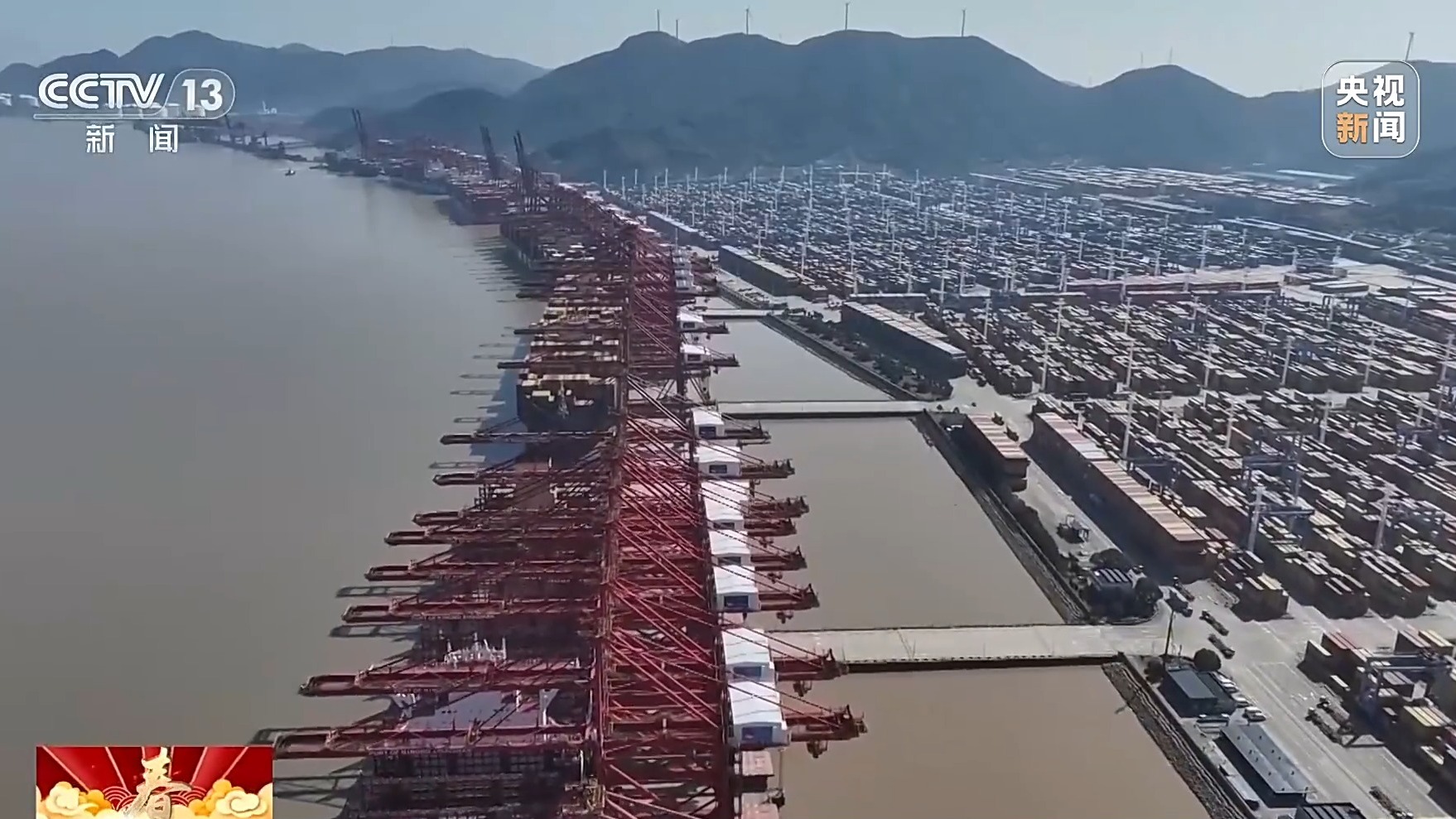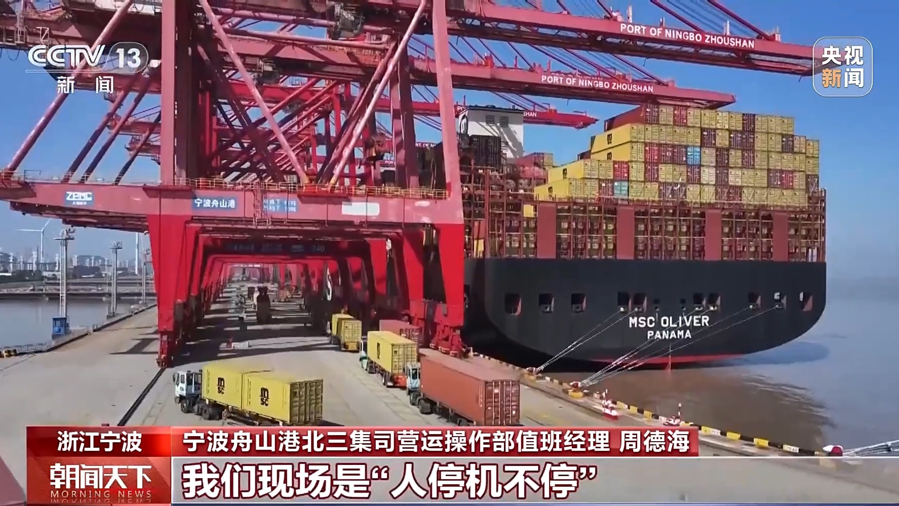 宁波舟山港北三集司营运操作部值班经理 周德海:这条船载重量超过了19万吨,这回在我们港区的作业量超过了两万标准箱,像这样的船型,整个春节期间还是比较多的。这几天出口箱量增长比较明显,我们现场是“人停机不停”。节后的第一波出口集中,客户都希望抢时间、赶船期,我们也争分夺秒确保货物能及时出运。