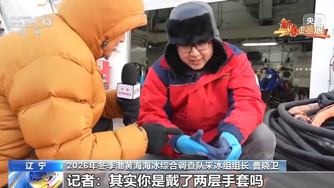 2026年冬季渤黄海海冰综合调查队采冰组组长 曹晓卫:戴了两层手套,里面的这层主要起到防水作用,外面主要是保暖保温作用。这么长时间的户外作业很容易把手套冻透,基本上我们作业完成之后,手会红肿,甚至吃饭的时候已经拿不起筷子了。