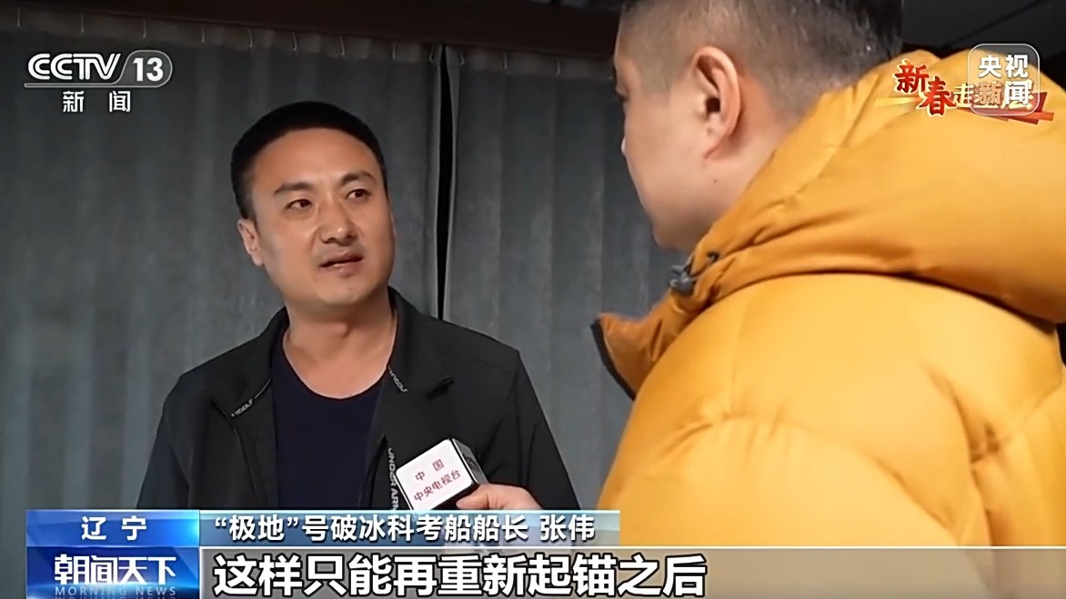“极地”号破冰科考船船长 张伟:现在只能起锚之后换另外一个地点重新抛,绕开大块的浮冰区,因为咱们现在是在航道附近,如果说持续走锚,我们很可能会碰到其他船或者是海底的油管,这是非常危险的。