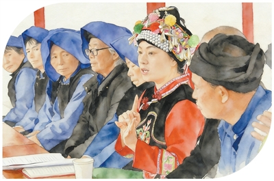 全国人大代表、云南省大理白族自治州南涧彝族自治县碧溪乡凤仙村村民鲁丽华(右三)在南涧彝族自治县无量山镇新政村宣讲全国两会精神。