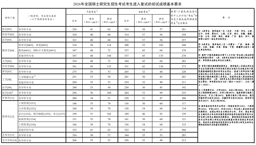 2月28日,教育部发布《2026年全国硕士研究生招生考试考生进入复试的初试成绩基本要求》(国家分数线)。各招生单位根据《2026年全国硕士研究生招生工作管理规定》,在国家分数线的基础上,自主确定并公布报考本单位的考生进入复试的初试成绩要求及其他学术要求。
