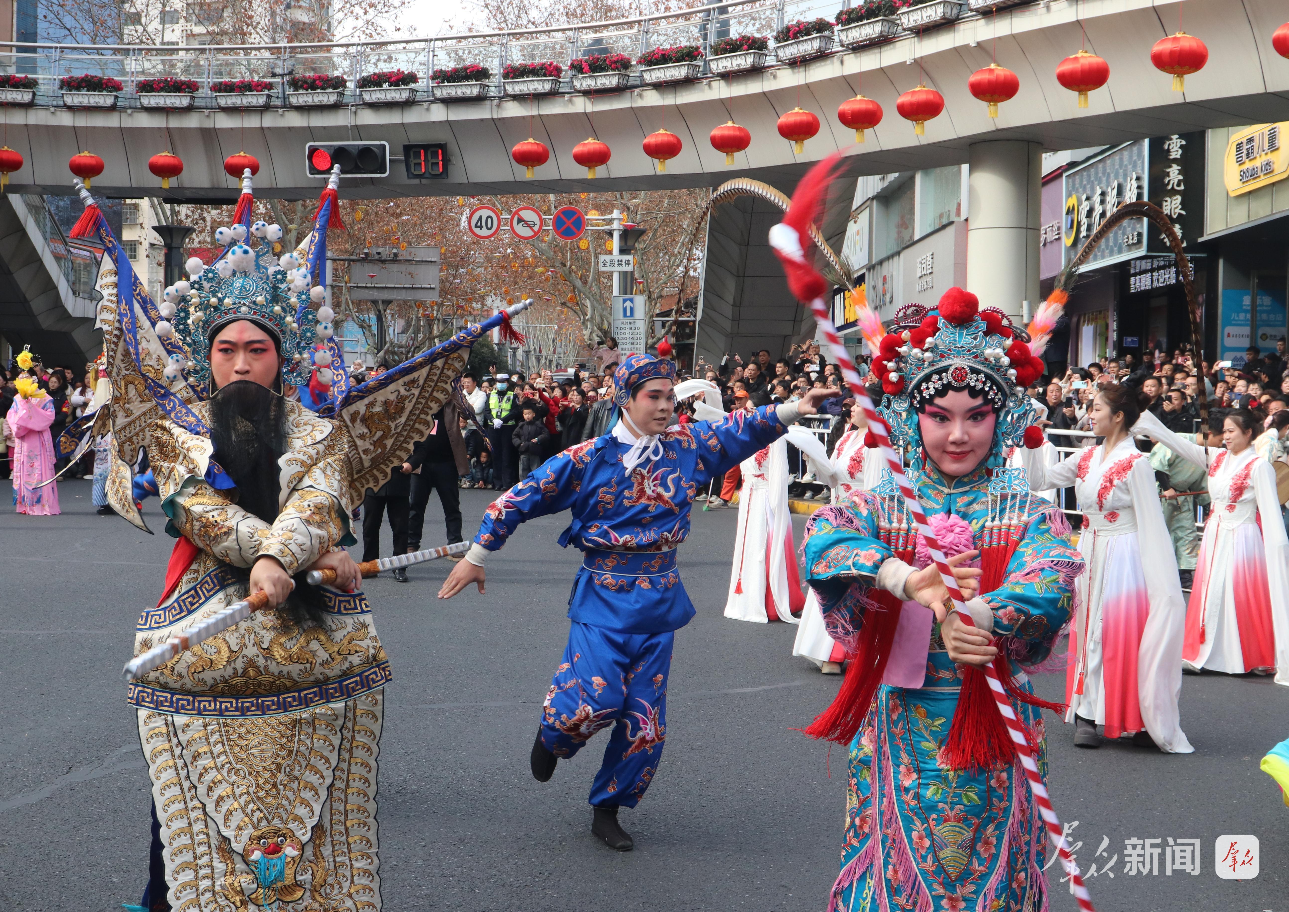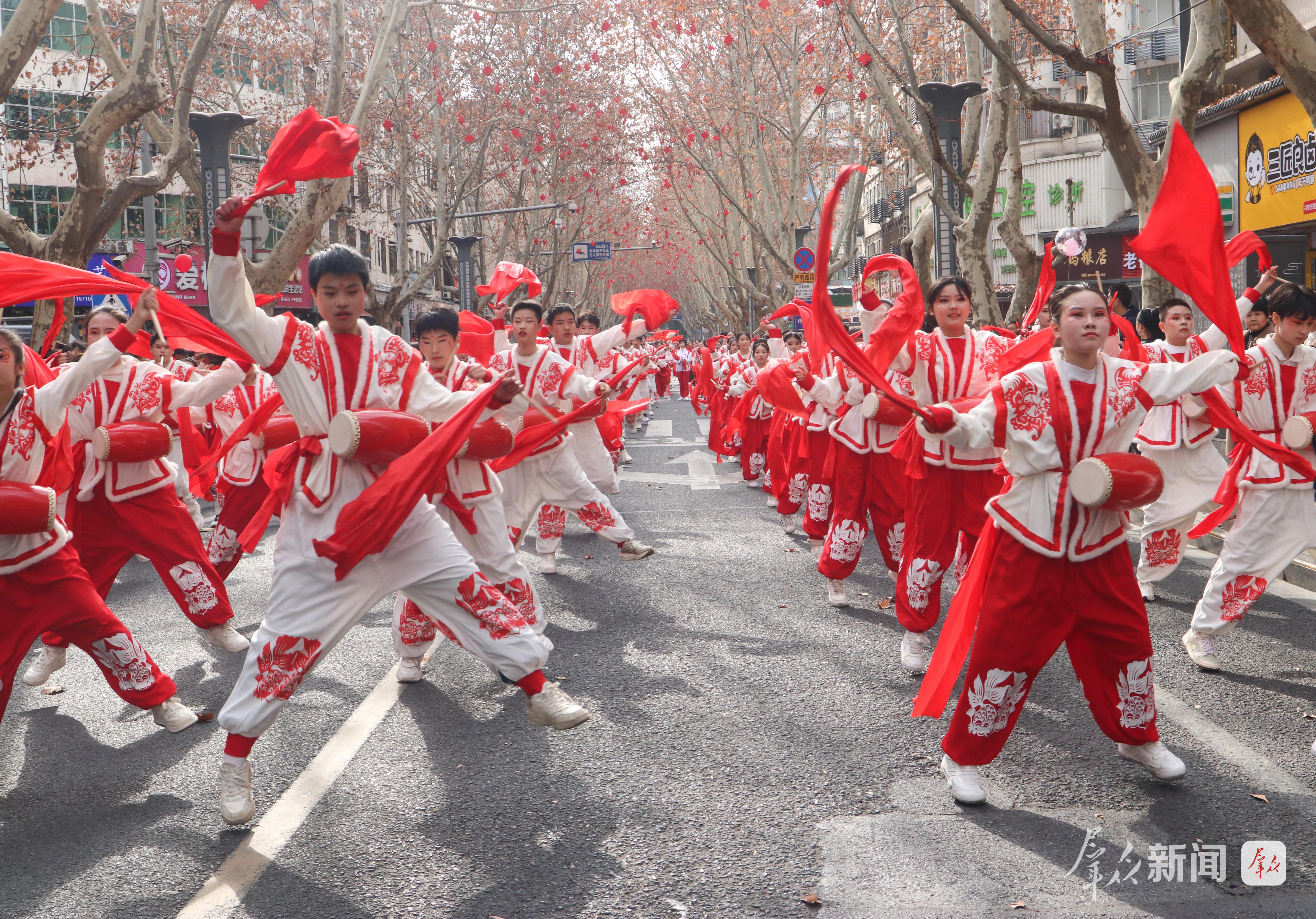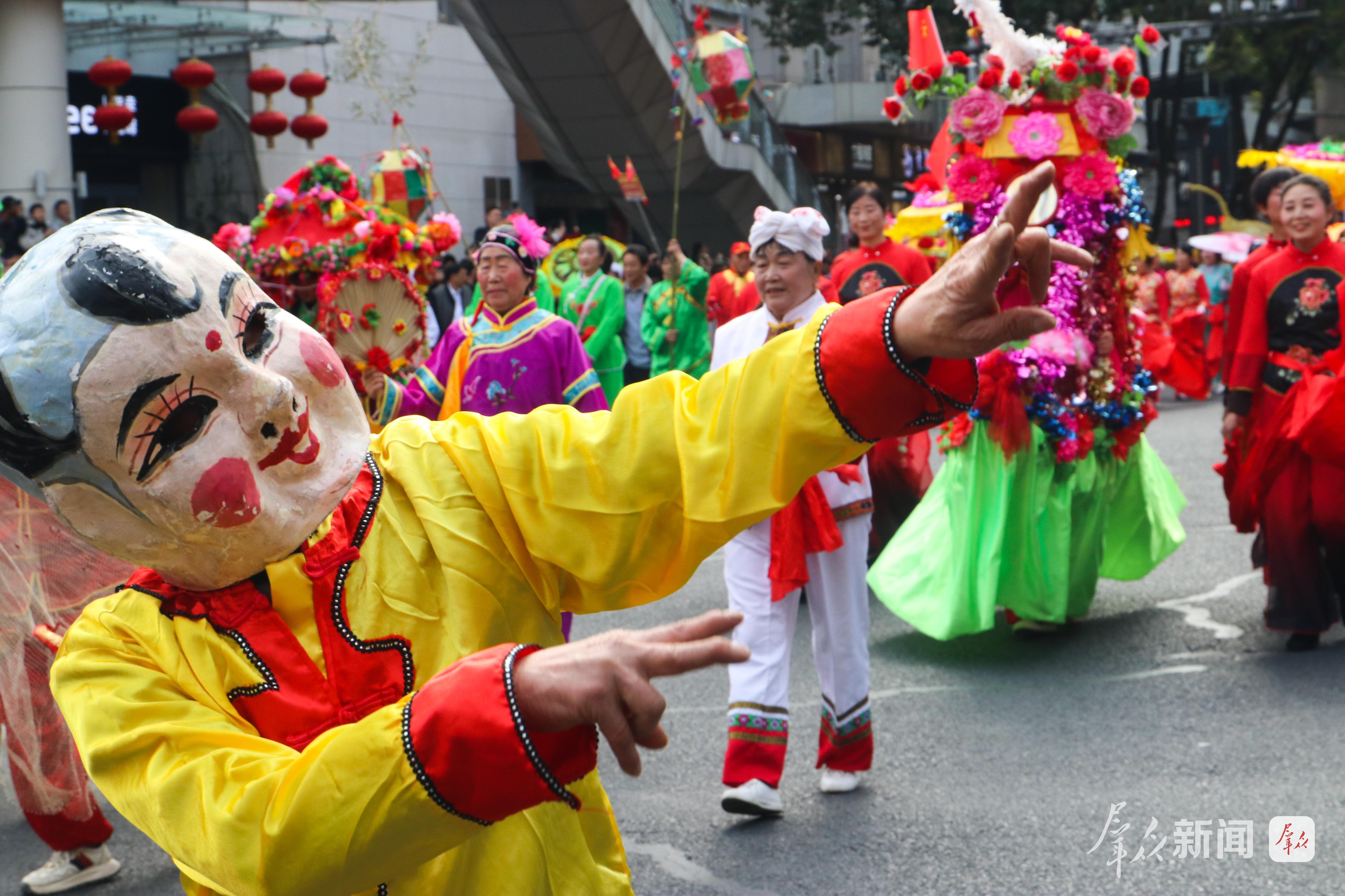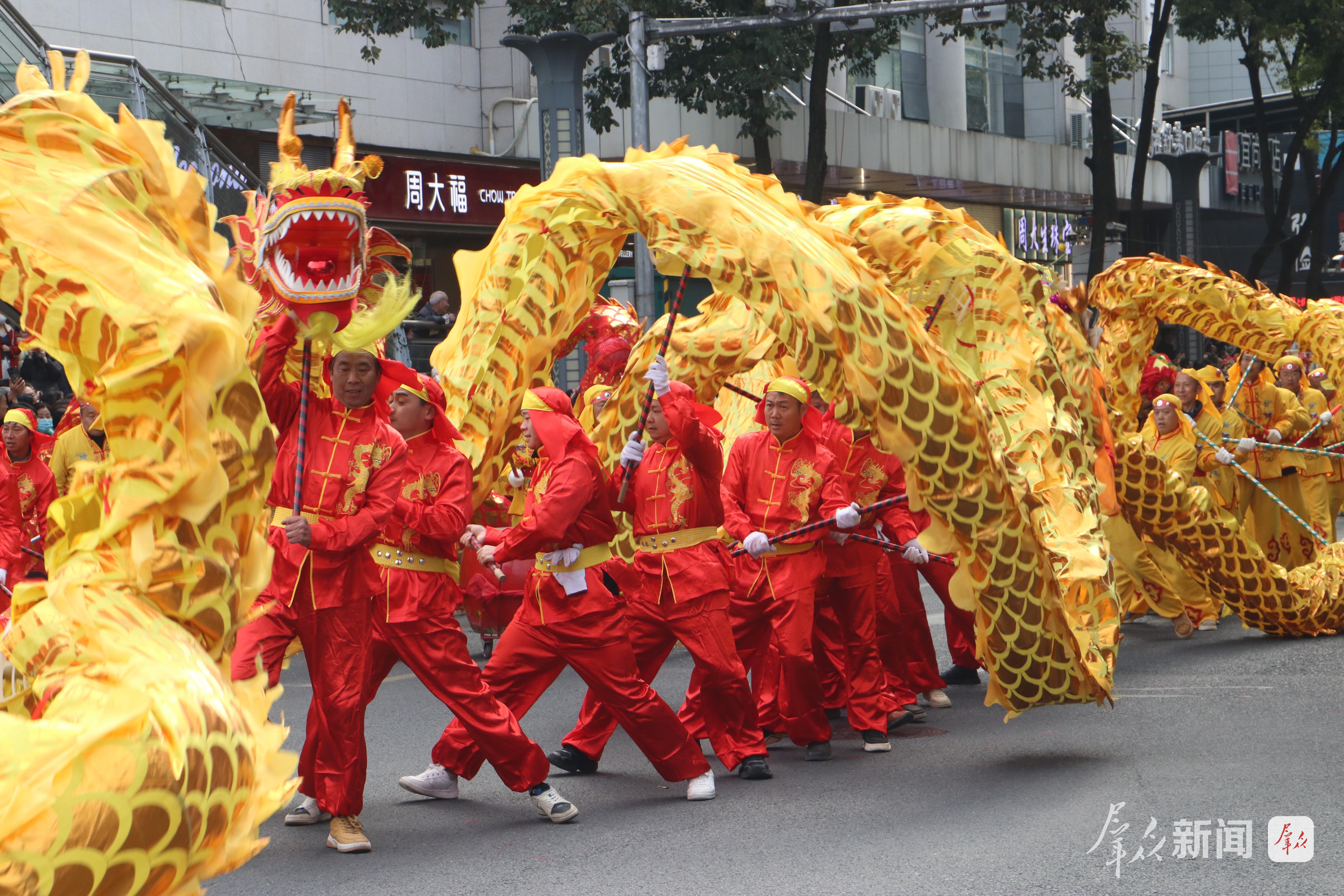 舞龙的汉子们擎着金龙狂奔腾跃,龙身随着绣球翻飞,在阳光下划出道道弧线;踩高跷的艺人足蹬三尺木跷,时而扭起秧歌步,时而俯身与路边孩童击掌;彩莲船的“船娘子”碎步轻移,艄公手握船桨在前逗趣,一唱一和间,汉江边的渔家风情跃然眼前……社火队员们身着五彩斑斓的服饰,踩着鼓点旋转、跳跃,耍出新年精气神。