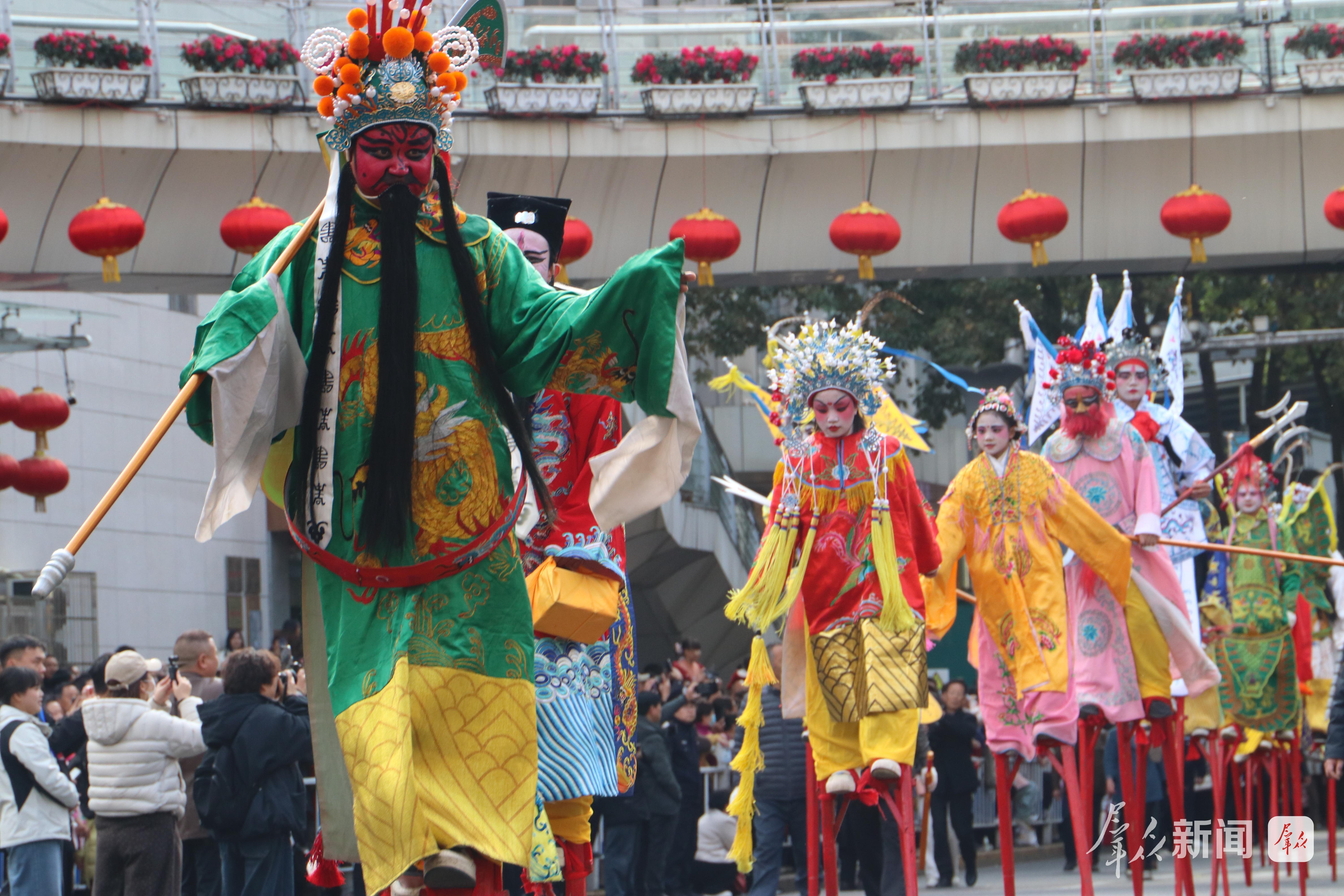 巡游沿途,观众呼朋引伴、摩肩接踵,欢呼声、喝彩声此起彼伏。大家纷纷拿出手机、相机记录精彩瞬间,大人小孩脸上都洋溢着新春的喜悦,不少市民跟着队伍一路前行,沉浸式体验社火巡游的热闹。