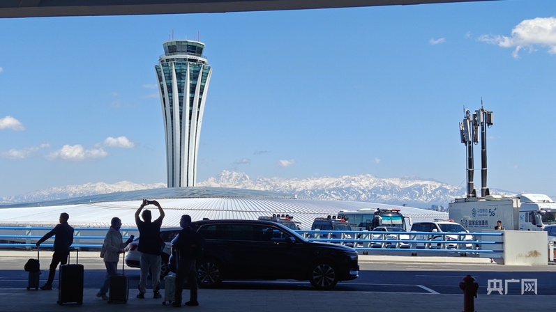 旅客在乌鲁木齐天山国际机场航站楼前拍照留念 (央广网记者郭璁悦摄)